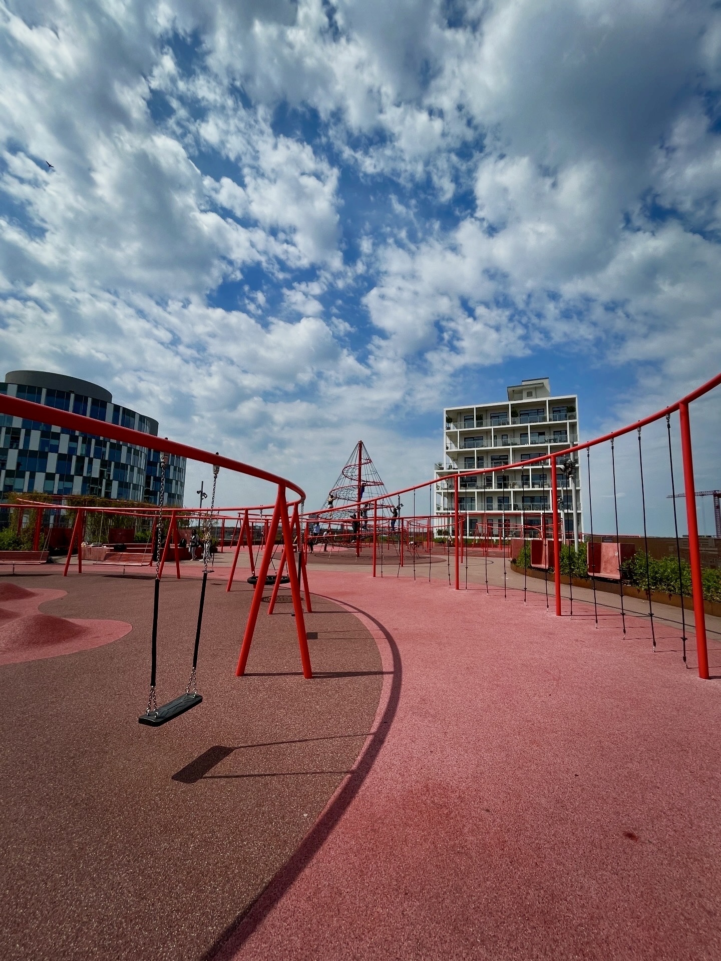 A rooftop playground with a sporty twist! Trampolines, swings, climbing structures and amazing views of the canal and modern architecture.