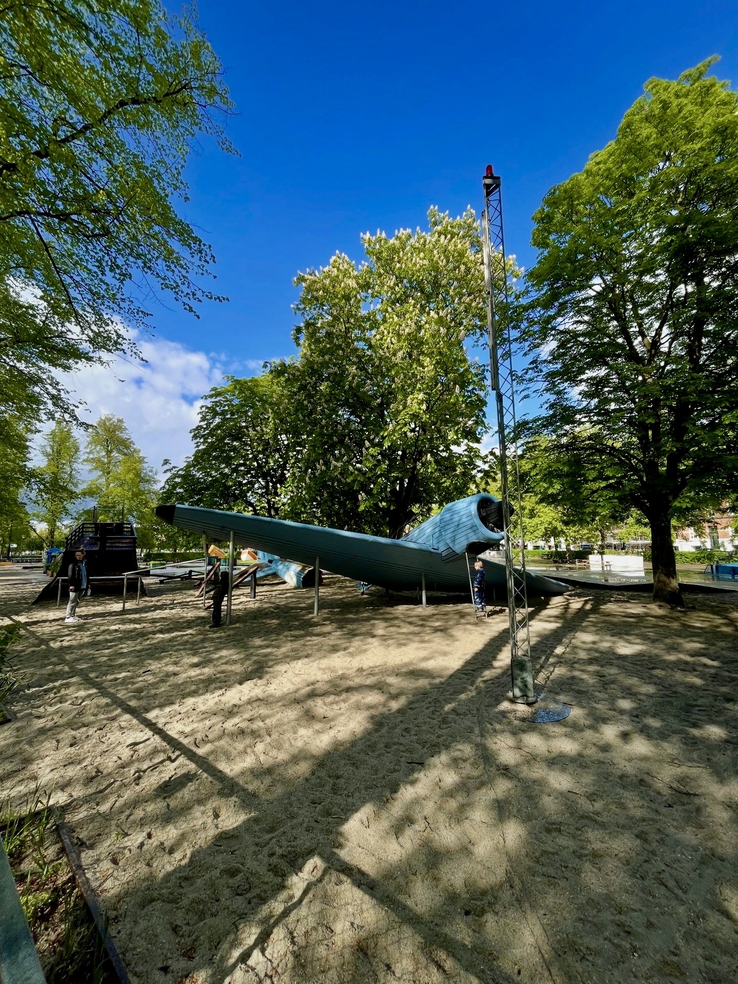 Super atmospheric playground with slides and climbing structures shaped like abandoned planes and ships. Kids' imagination will run wild!